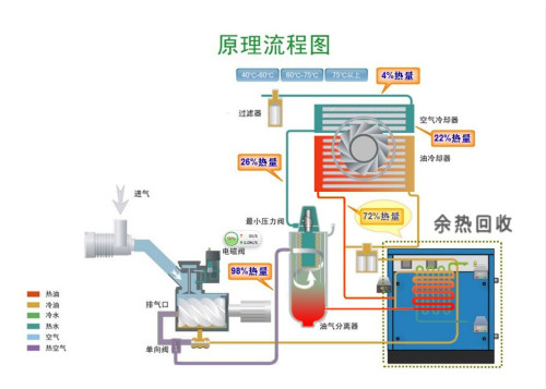 在以上過程中,高溫高壓的油、氣所攜帶的熱量大致相當于空氣壓縮機功率的3/4其溫度通常在80℃—100℃之間。螺桿式空氣壓縮機通過其自身的散熱系統(tǒng)來給高 溫高壓的油、氣降溫的過程中,大量的熱能就被無端的浪費了。