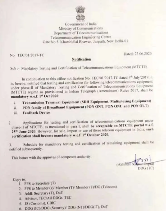 2020年6月中旬,印度電信工程中心(TEC)再次修訂了有關(guān)電信設(shè)備強制性測試和認證(MTCTE)程序,此次修訂放松了MTCTE程序中認證產(chǎn)品標簽的要求。根據(jù)公告內(nèi)容,加貼標簽的強制要求可以延期至2021年4月1日,即從2020年10月1日算起,過渡期6個月。
