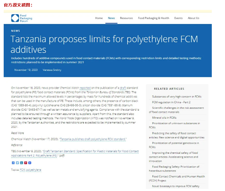 2020年11月18日,據(jù)化學(xué)觀察報(bào)道,坦桑尼亞標(biāo)準(zhǔn)局(TBS)發(fā)布食品接觸材料(FCMs)聚乙烯(PE)標(biāo)準(zhǔn)草案。