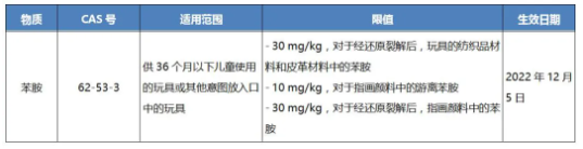 2021年6月4日,歐盟委員會批準指令(EU) 2021/903,修訂玩具安全指令2009/48/EC,將苯胺新增至玩具安全指令2009/48/EC附件II附錄C中,限制供36個月以下兒童使用的玩具或其他意圖放入口中的玩具中苯胺的使用,該要求將從2022年12月5日起正式實施。