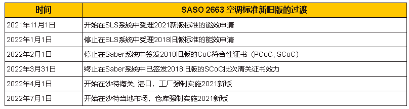 2021年8月23日,沙特標(biāo)準(zhǔn)局SASO正式公告了空調(diào)能效 SASO 2663新舊版標(biāo)準(zhǔn)的執(zhí)行過渡期,請(qǐng)相關(guān)廠商關(guān)注標(biāo)準(zhǔn)執(zhí)行的重要時(shí)間點(diǎn),盡快在標(biāo)準(zhǔn)過渡期內(nèi)完成新標(biāo)準(zhǔn)測(cè)試并及時(shí)更新能效證書。