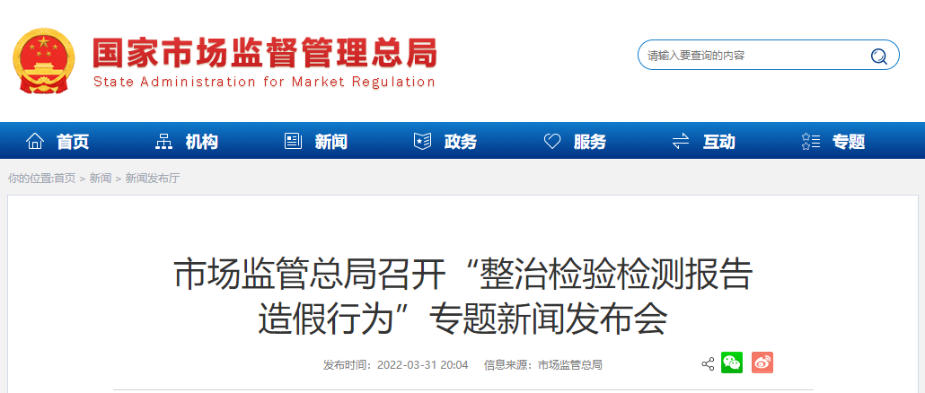 2022年3月31日,國家市場監督管理總局以“整治檢驗檢測報告造假行為”為專題召開新聞發布從2021年度各級市場監管部門已經查處的檢驗檢測違法違規案件中,選取了17個涉及檢驗檢測報告造假的典型案例進行集中曝光。