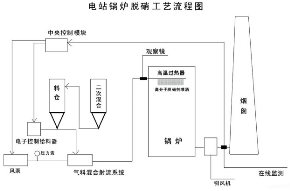固態高分子SNCR脫硝工藝流程是一種爐內脫硝工藝流程,它采用粉體氣相自動輸送系統,在爐體煙氣出口處及爐膛高溫區選擇幾處合適位置打孔將高分子脫硝劑噴入,在合適反應溫度區將NOx還原成N2和H2O。
